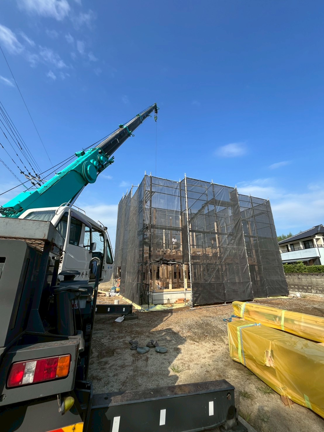快晴の空のもと、N様邸の上棟を行いました!これまで図面で見ていたお家が立体になり、いよいよ実感が湧く瞬間です。完成までスタッフ一同、心を込めて施工してまいります。